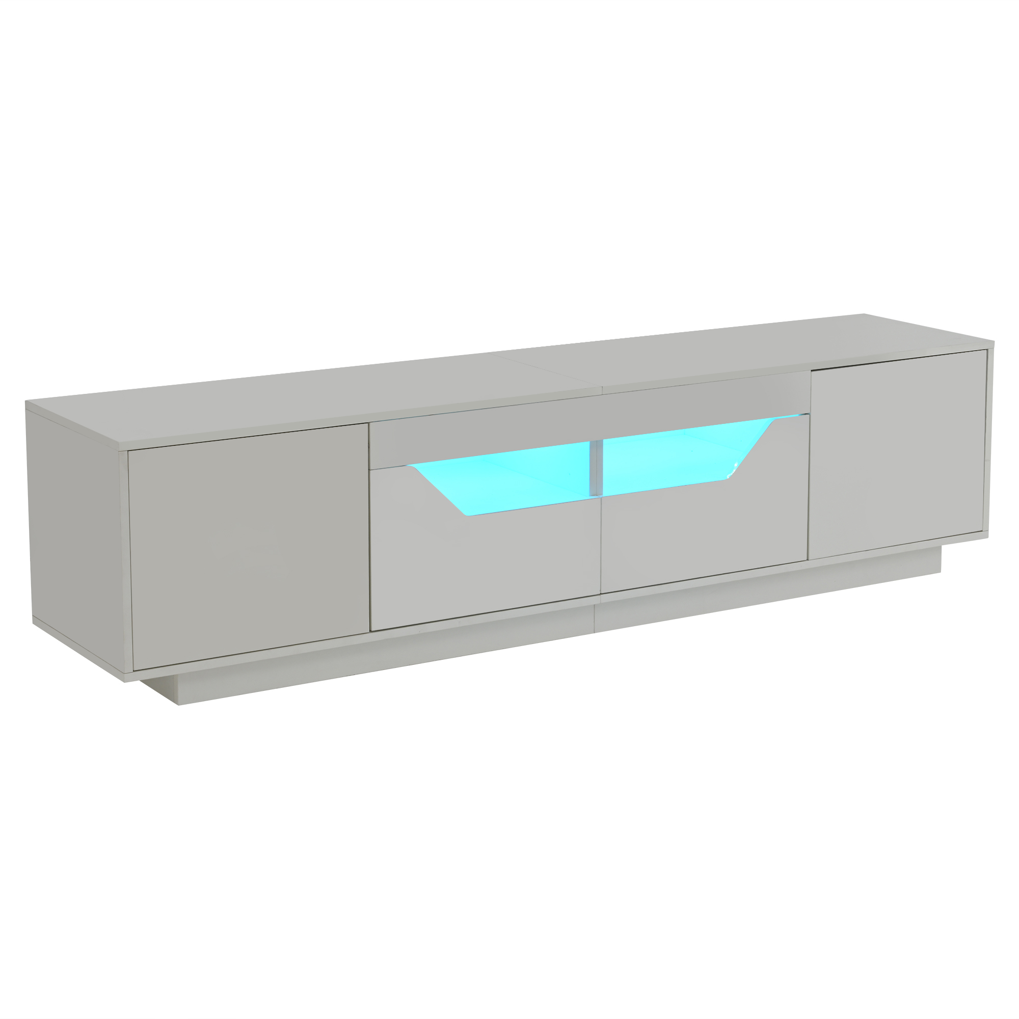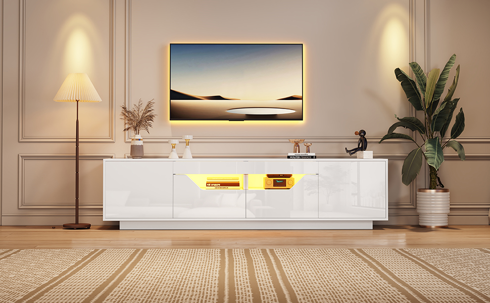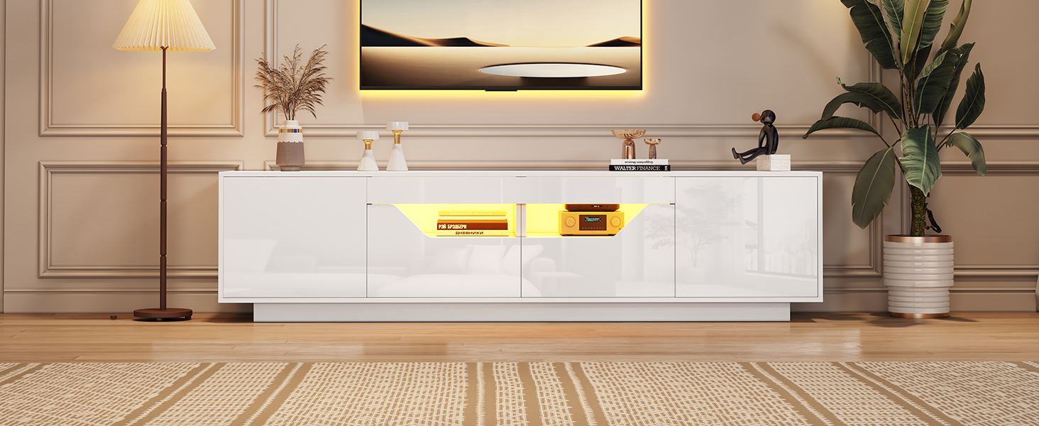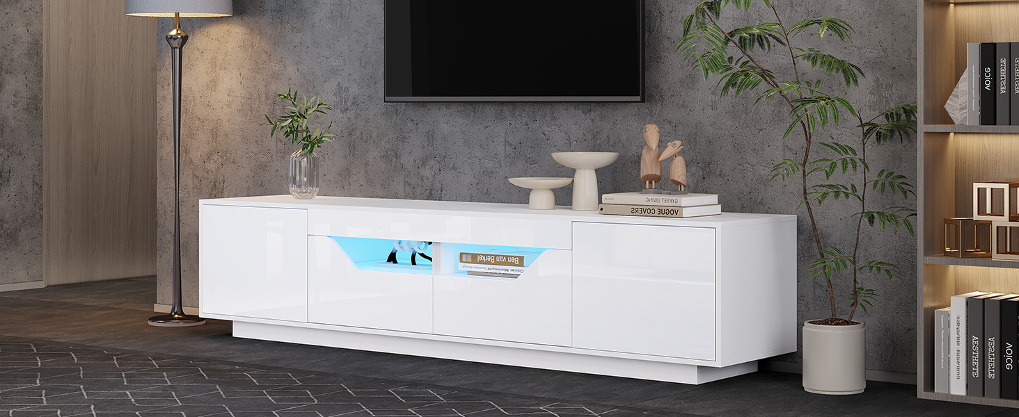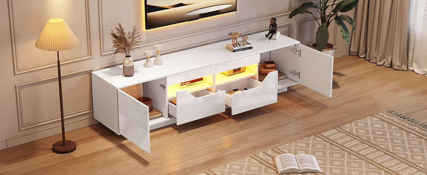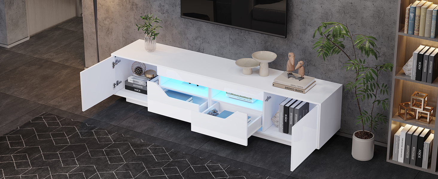 Product Name:Highgloss TV Stand, 2doors 2drawers 2 open storage areas,TV Cabinet Storage Sideboard with LED lights, TV Entertainment center for livingroom bedroom, 180*40*45cm, White, maximum for 75 inch TV