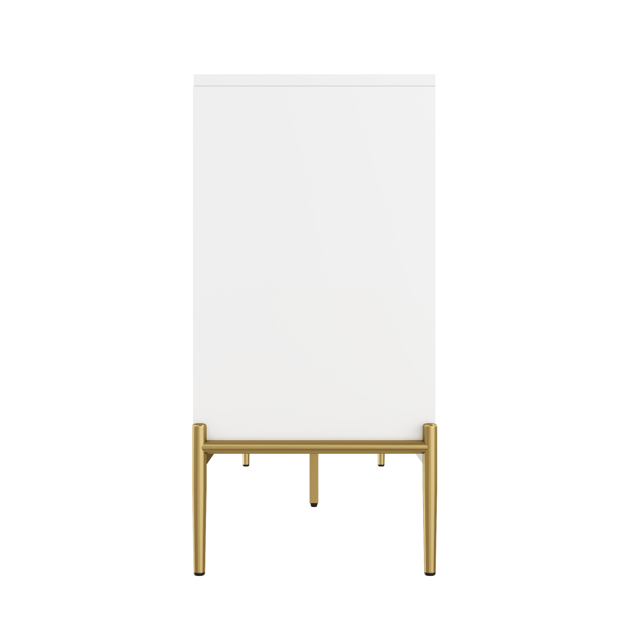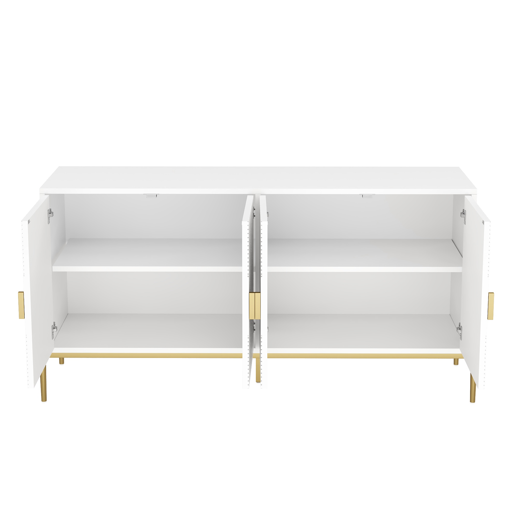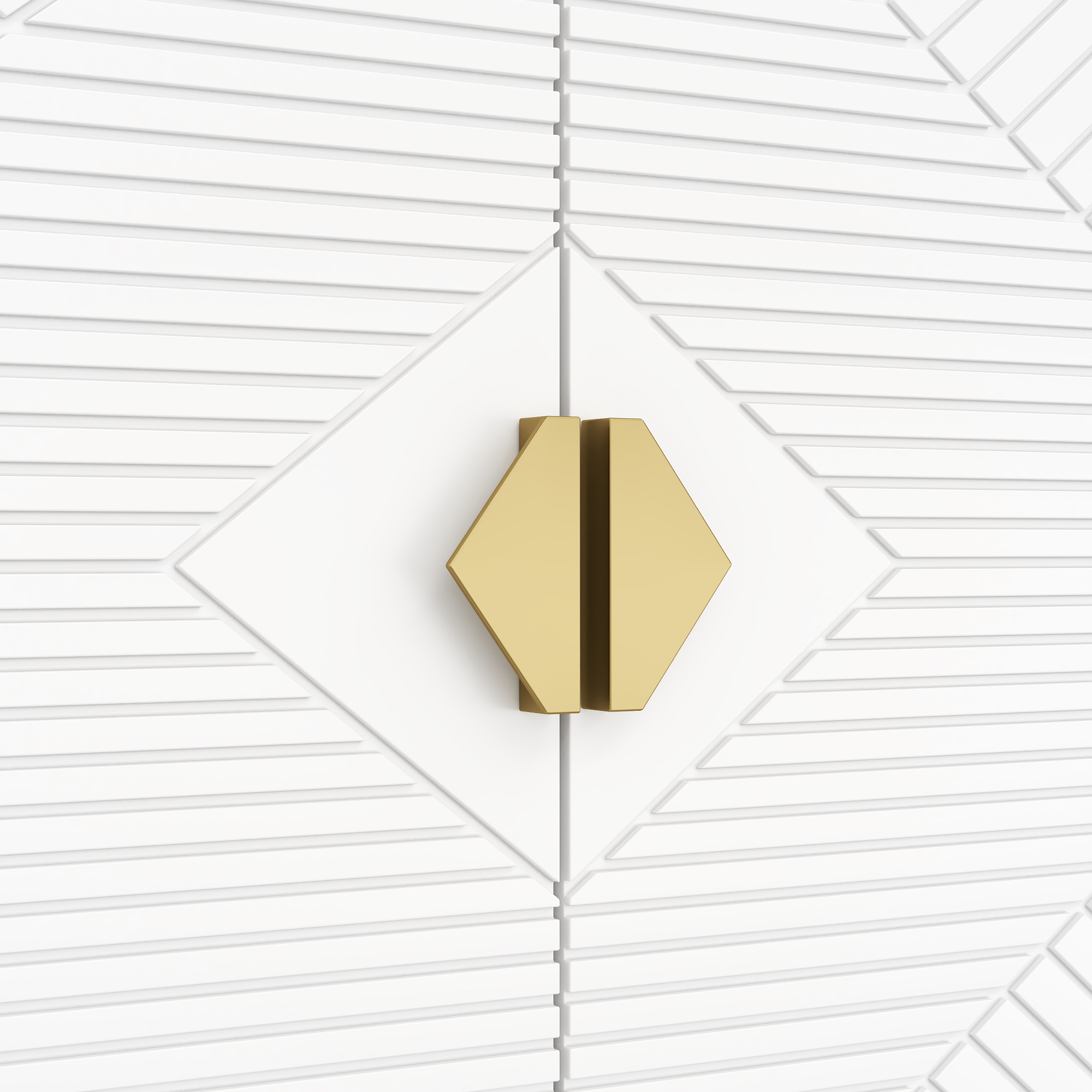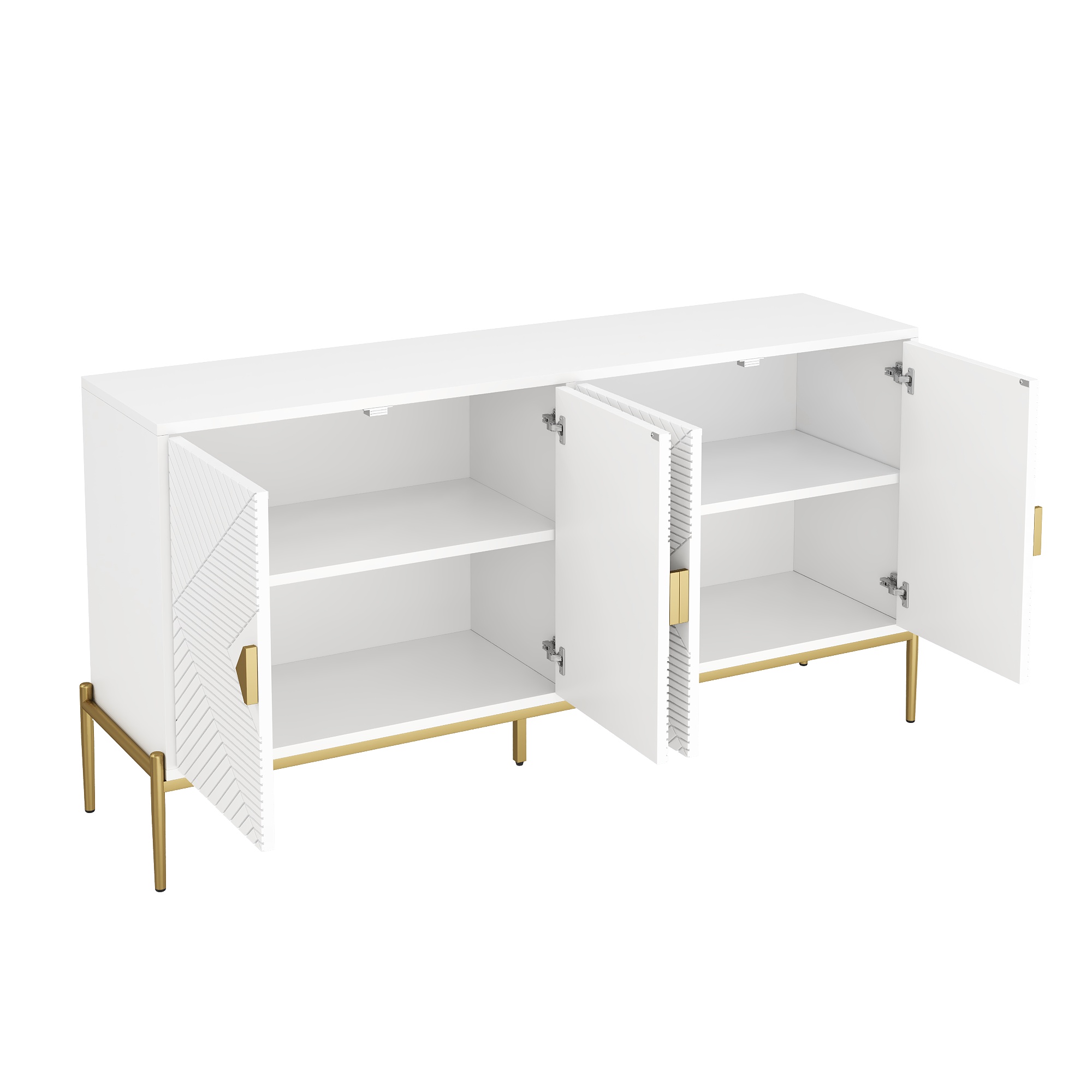 This modern, light, and luxurious geometric sideboard impresses with its simple and elegant white color palette, complemented by striking geometric 3D textures and golden metal accents that create a unique mid-century modern style. The thoughtfully designed interior makes it a wonderful addition to any home! It ensures the durability of the cabinet while adding a sense of depth. The metal legs enhance the stability of the cabinet and give the space a modern touch. Whether placed in the living room, dining room, or entryway, this sideboard blends seamlessly with any home décor and stands out as a remarkable piece of furniture that combines aesthetics and functionality.