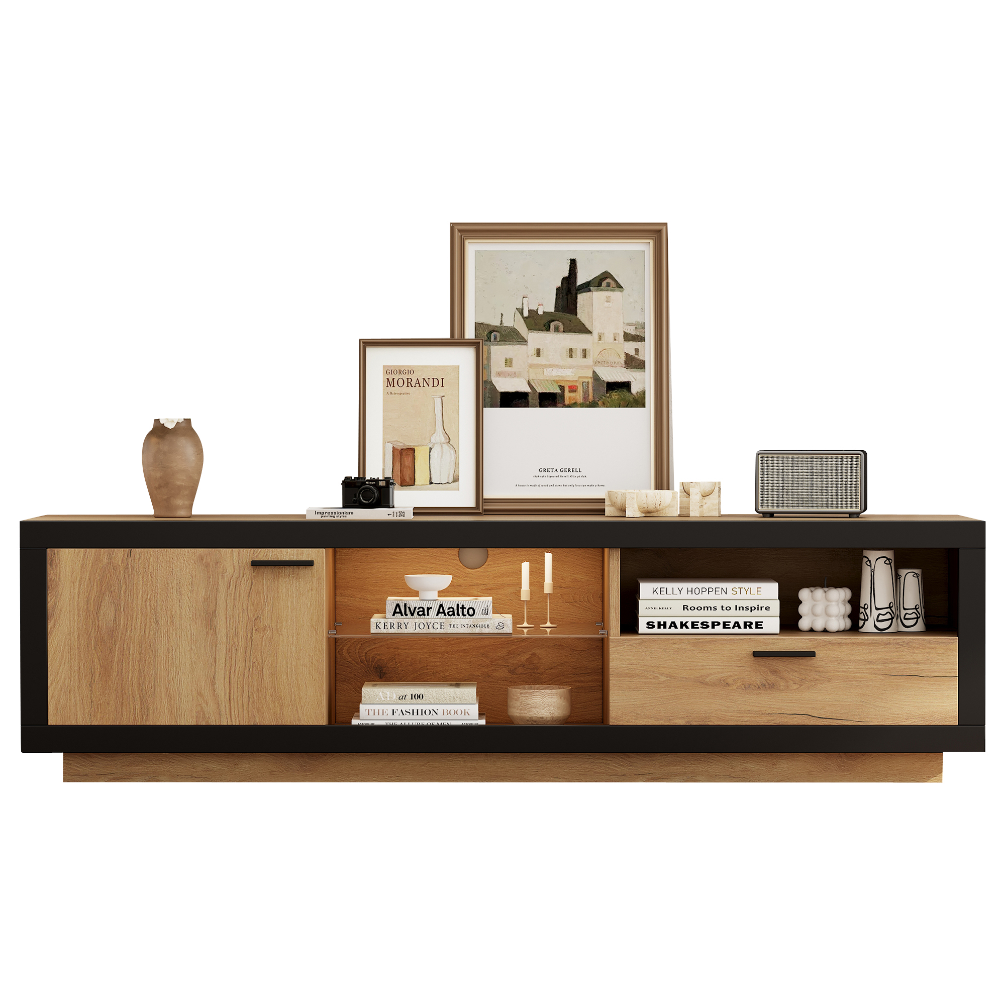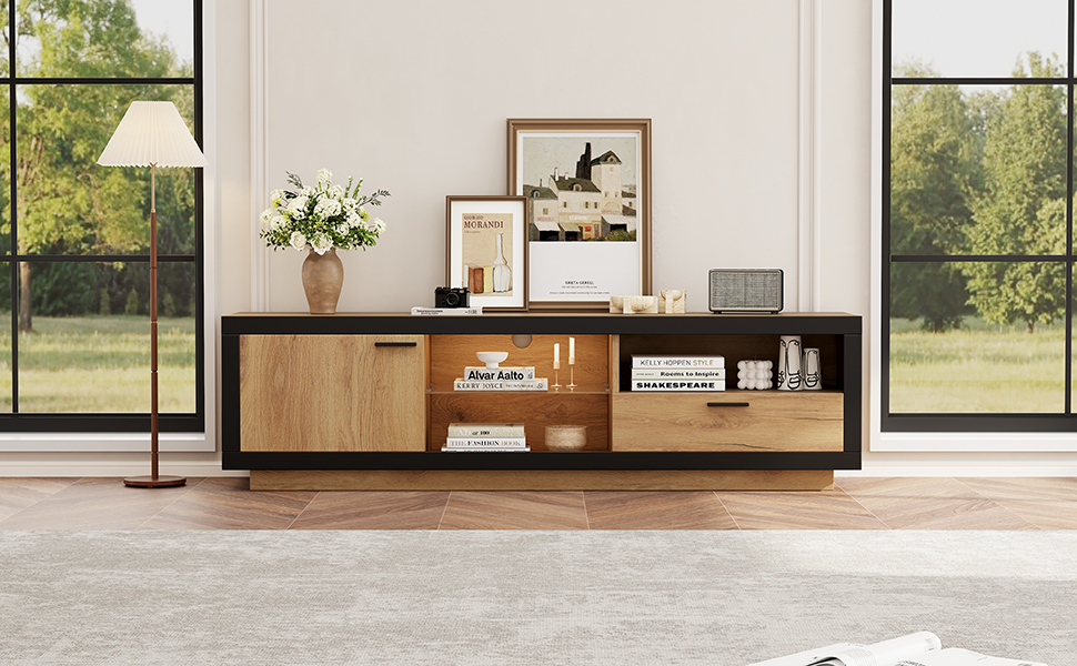 - Unique Design: This TV stand features a wood grain finish with a black border, creating a simple yet beautiful overall look. The unique color scheme and staggered storage compartments add an artistic and design-oriented touch, making it a perfect choice for a TV stand.