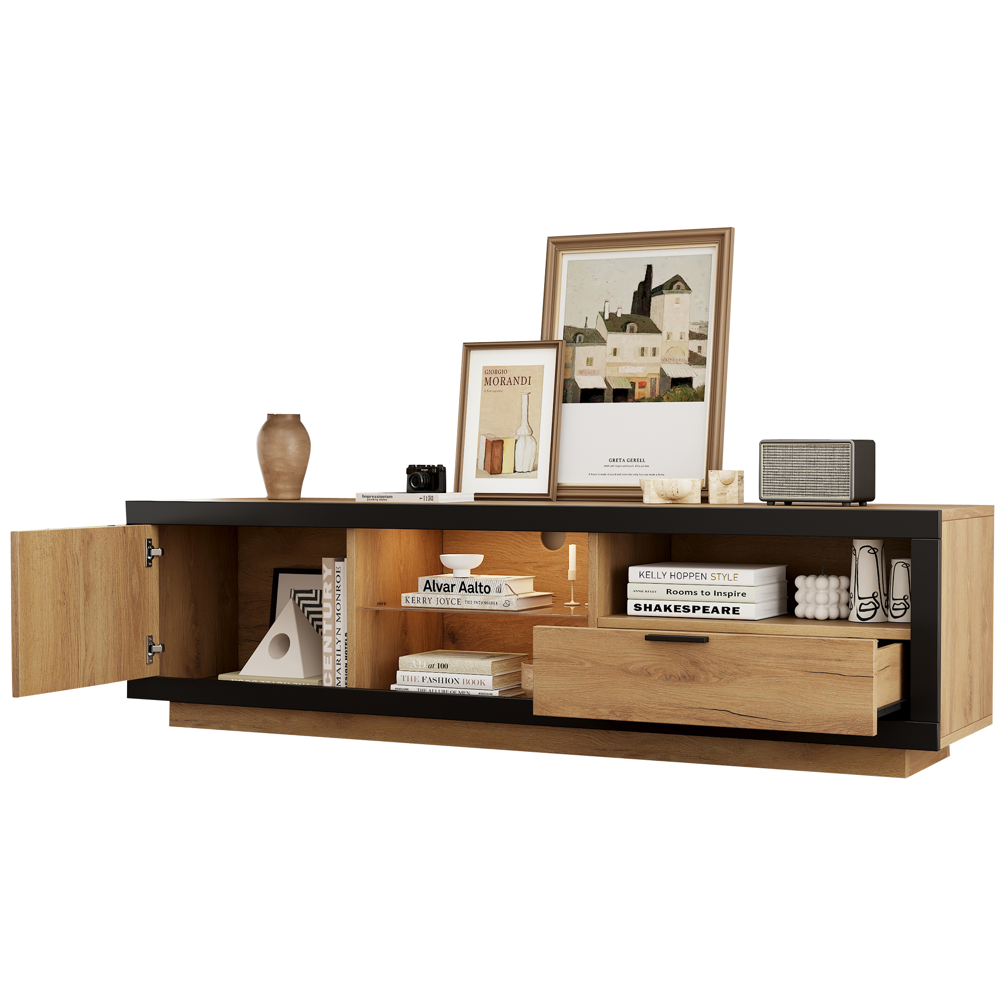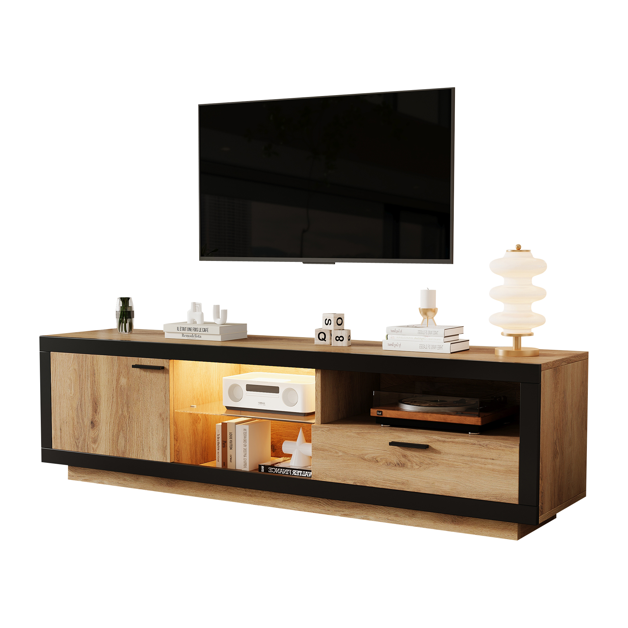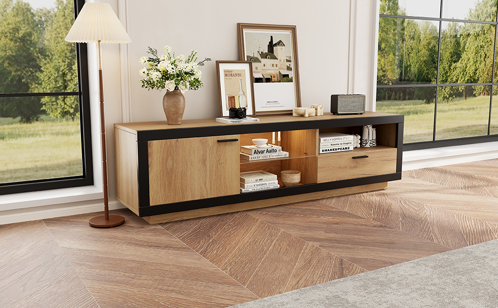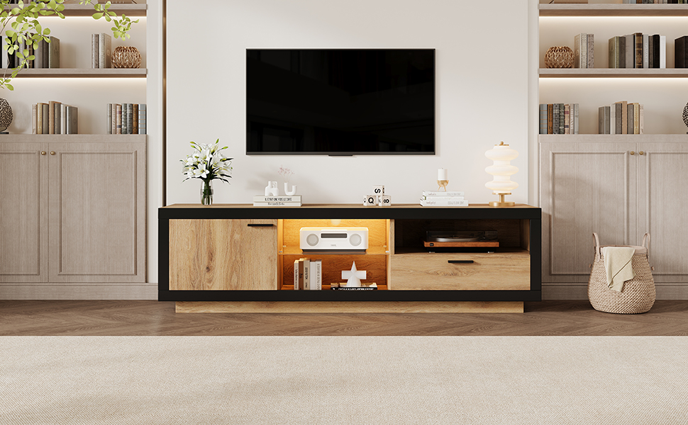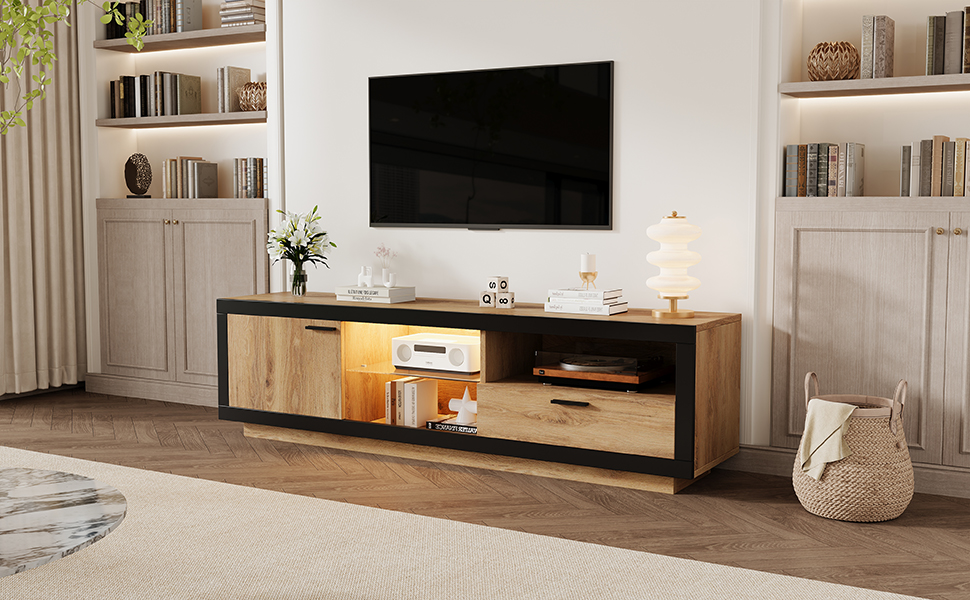 Product Name:TV Stand Cabient with 1 Drawer 1Door, TV Cabinet Storage Sideboard with LED lights,TV Entertainment center for livingroom bedroom, TV Console,TV unit,160*40*50cm, Wood+Black, PB Board, for 70 inch TV