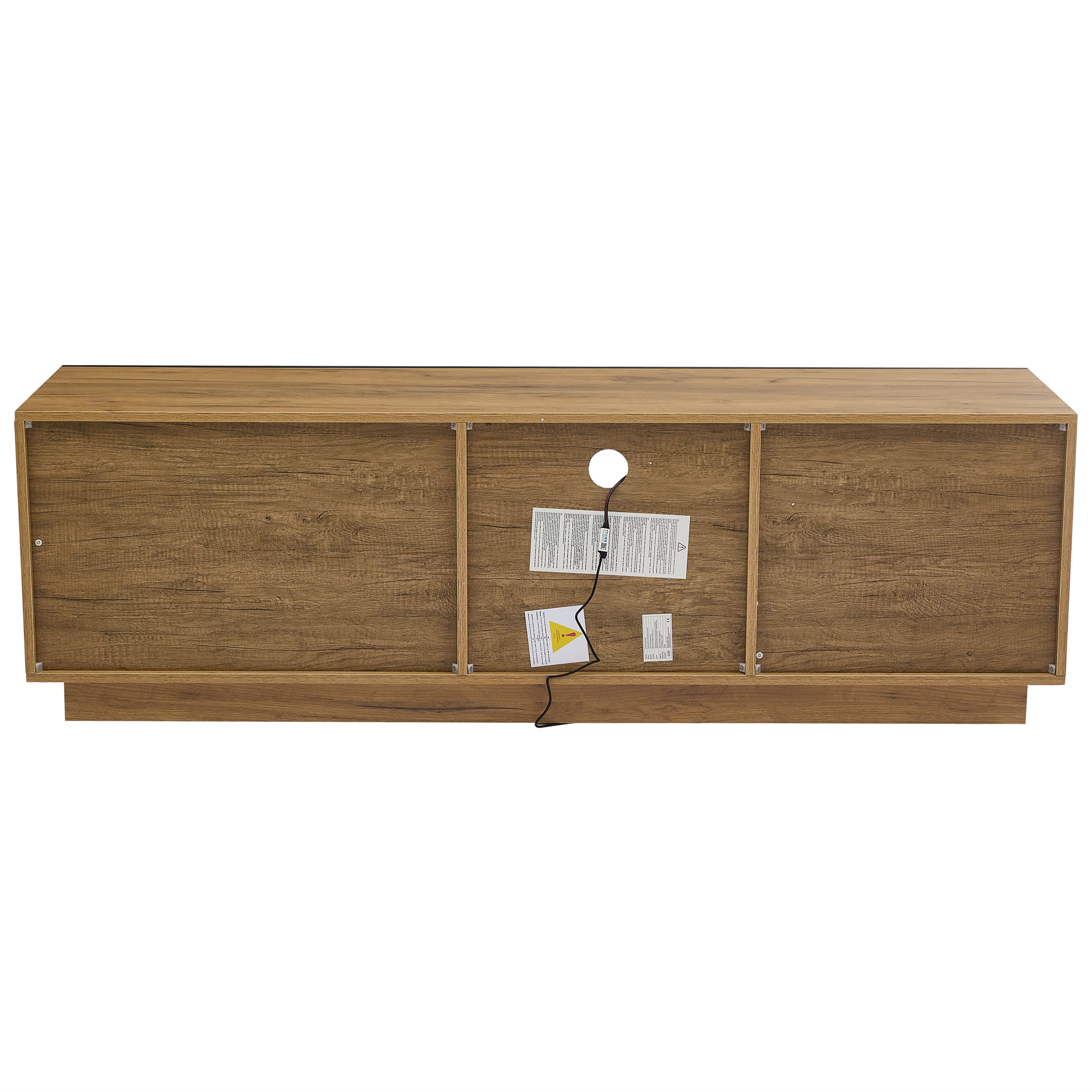 - Detailed Design: This TV cabinet features silent, soft-close hinges for a comfortable opening and closing experience. Pre-drilled circular cable management holes on the back make cable management easy. The tempered glass shelf in the center is sturdy, durable, and has a high load-bearing capacity.